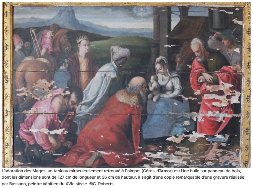 Dans un article du 07/03/2025, la presse régionale (Bretagne : ce chef-d’œuvre miraculeusement retrouvé à Paimpol a besoin de votre vote pour être sauvé) nous informe qu’un tableau, l’adoration des mages, a été retrouvé dans un local du presbytère de Paimpol. Une recherche de financement est en cours pour tenter de rénover cette œuvre sans doute inspirée par une gravure réalisée par Jacopo Bassano (1510-1592).